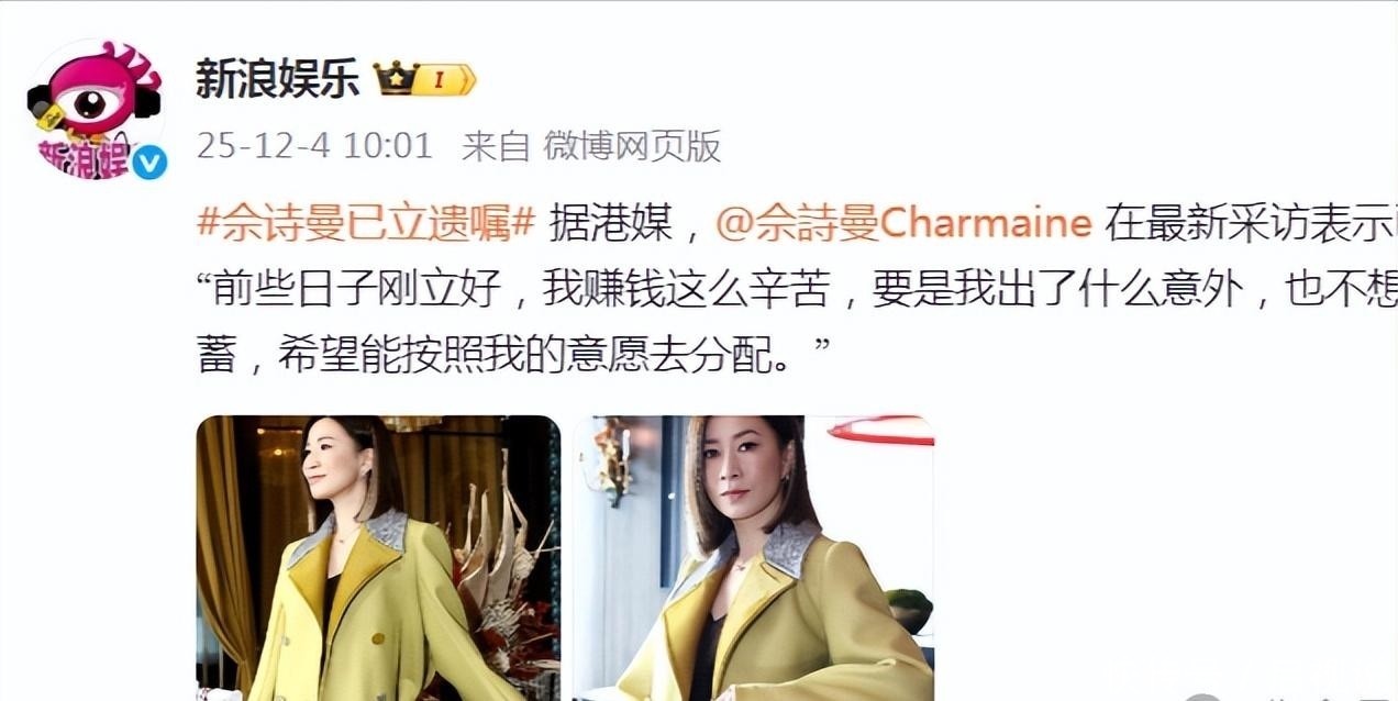 普通人拟定遗嘱,优先考虑的往往是伴侣和子女。但佘诗曼未婚无子,她的情感重心早已清晰映照在日常点滴之中。