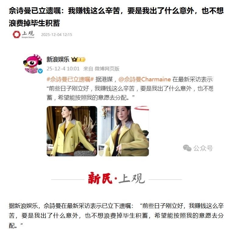 信息来源:原文登载于上观新日关于“佘诗曼已立遗嘱:我赚钱这么辛苦,要是我出了什么意外,也不想浪费掉毕生积蓄”的报道